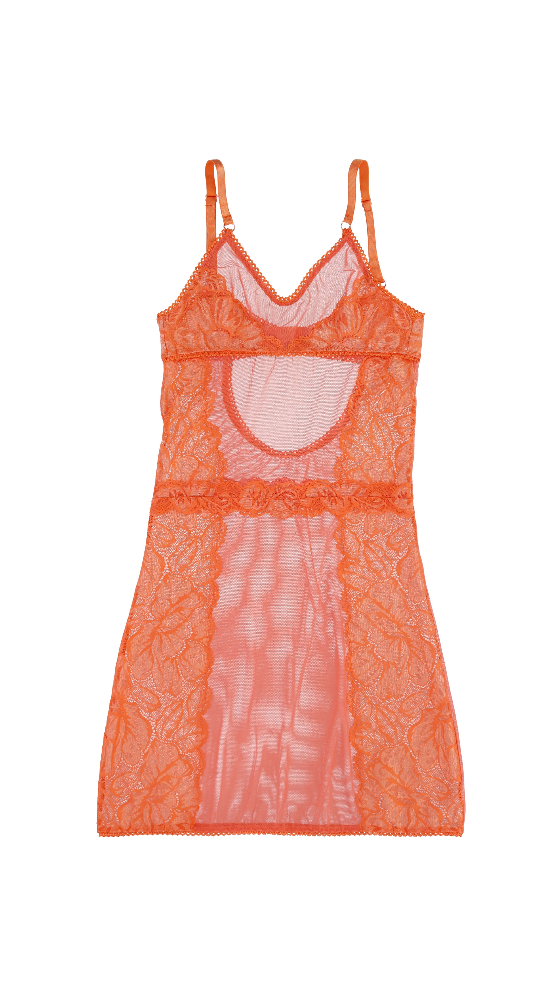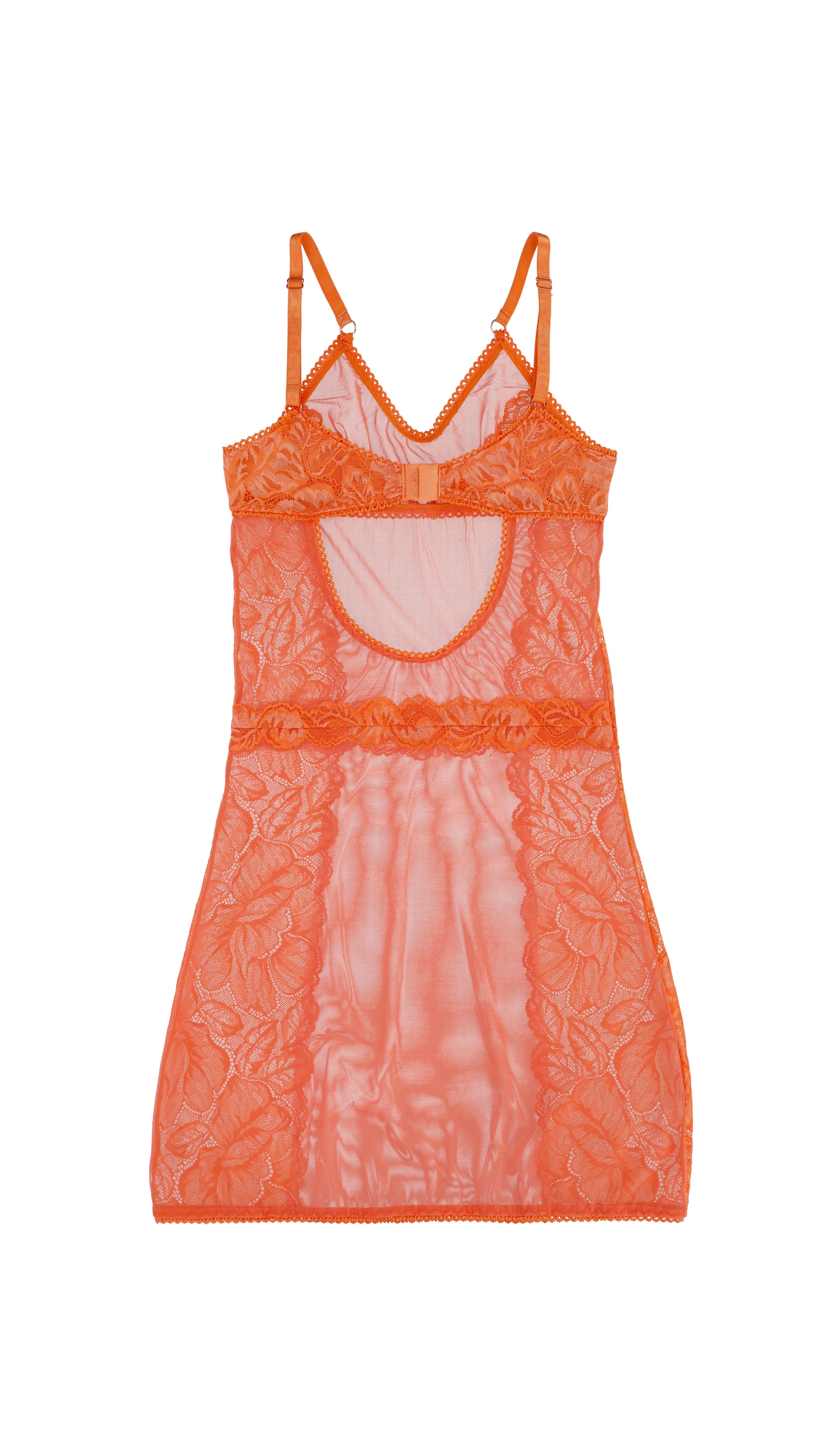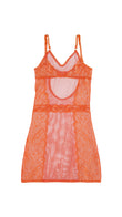 Bold yet airy. The Aglaea Babydoll features sheer orange mesh with lace accents that glide over the body with grace and sensuality.