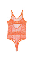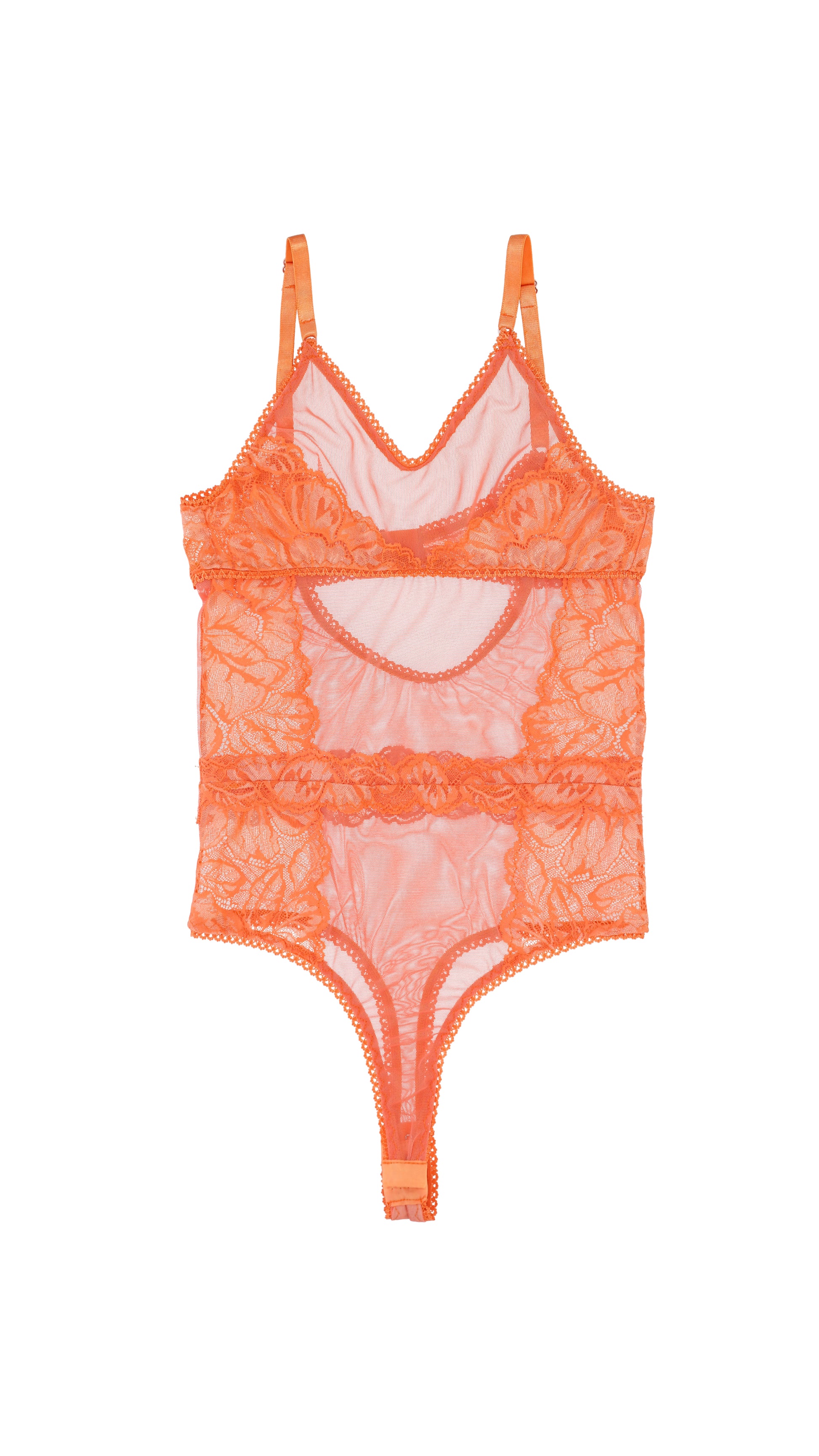 Sculpted to seduce. This orange lace and mesh bodysuit hugs every curve with elegance and confidence. Itβs made for women who love a strong silhouette with a soft, luxurious touch.