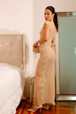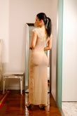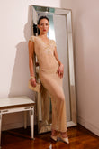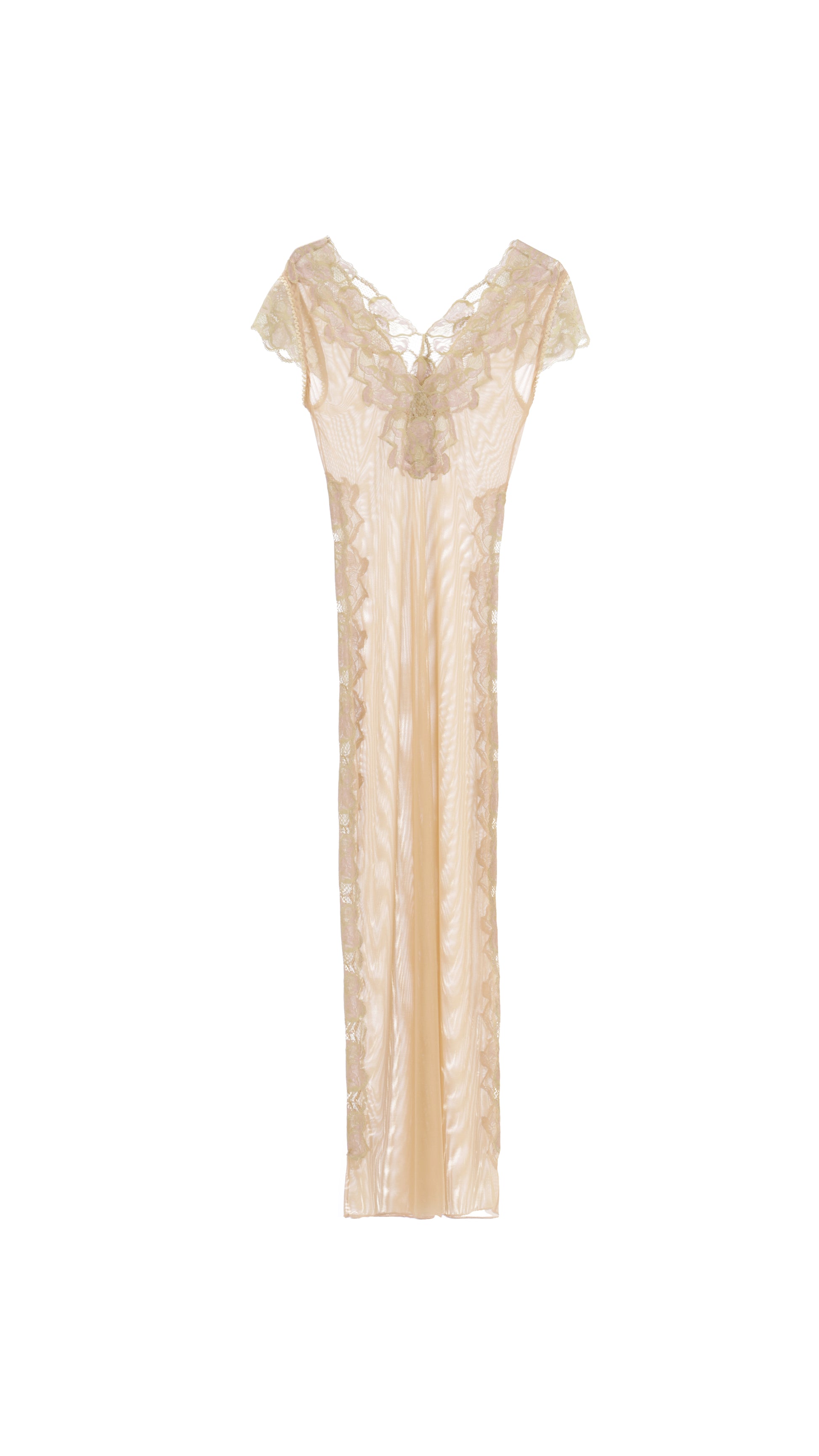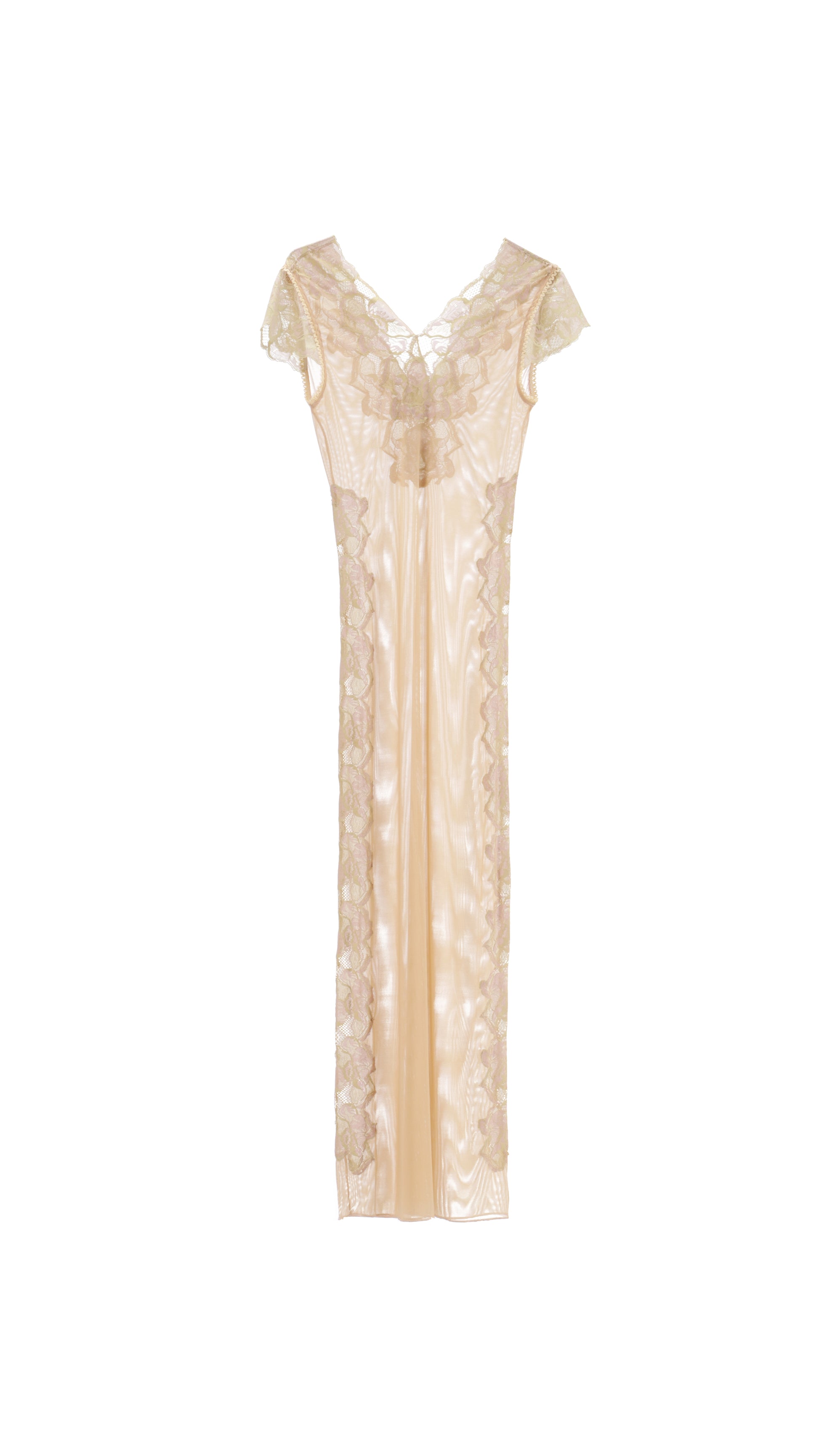 Elegant and empowering. The Athena Long Dress features sheer mesh and fine lace in soft blush tones, creating a fluid silhouette that celebrates every curve.
