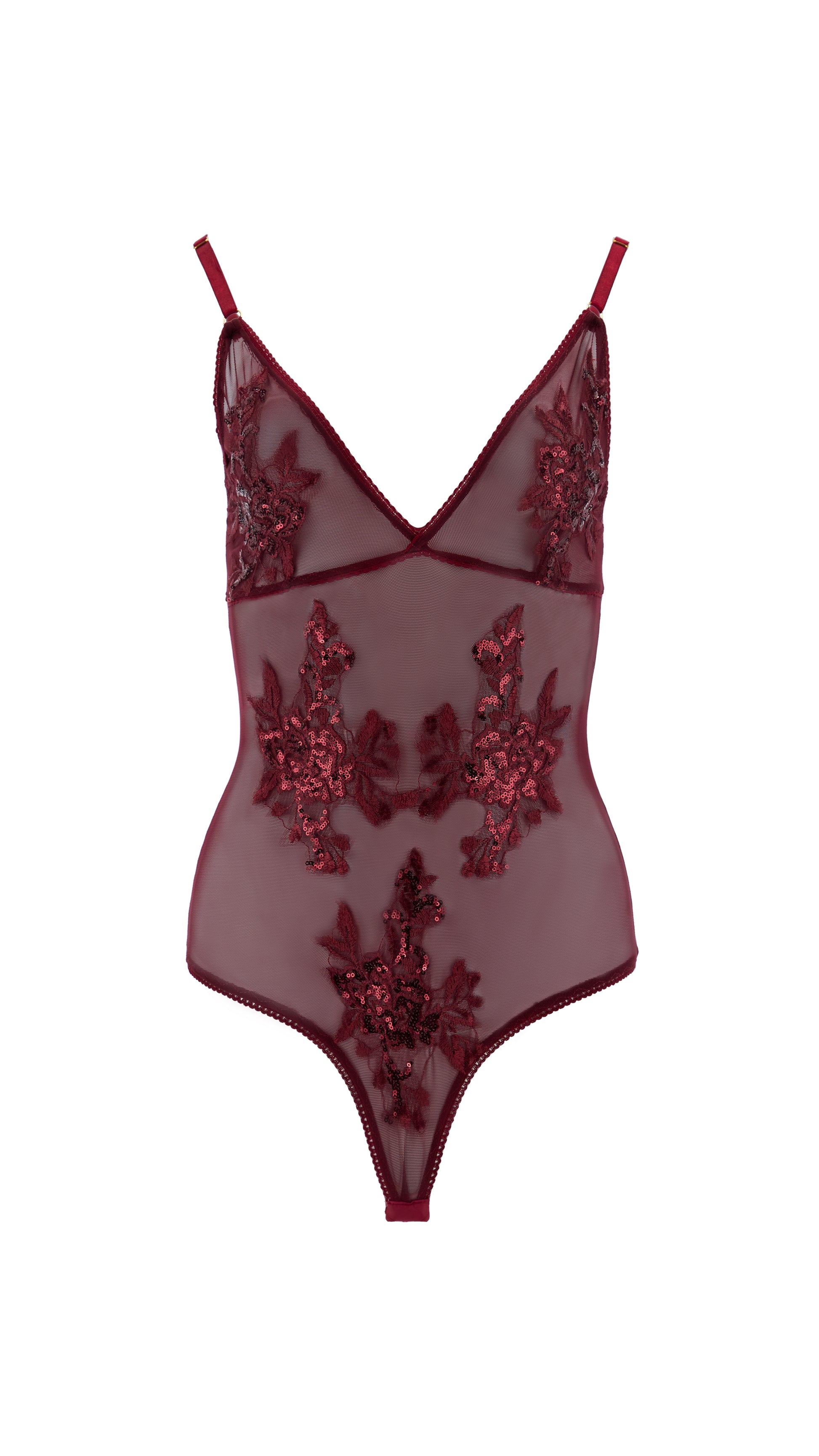 This standout piece is not one to miss out on. The Urania body has been meticulously designed to ensure a fit that accentuates every curve, decorating it in a beautiful red wine sequins appliqué design. The stretch mesh fits seamlessly on the body and adjustable straps allow for the perfect, figure-hugging fit.